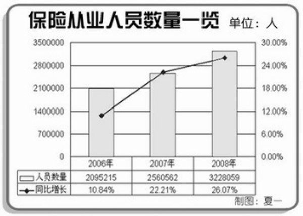 与目前很多行业减员缩岗相反,保险业近年来一直保持着旺盛的人才需求。自2007年下半年开始,保险业的人才流进即出现了提速趋势。据保监会公布的数据,2008年末,保险业从业人员322.8万人,比上年末增加66.7万人,同比增长26.07%。