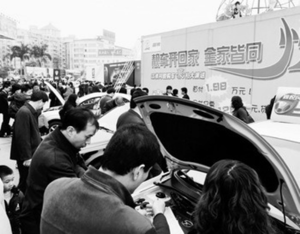 | 市民在售车现场了解汽车性能。近日,福州举办1.6升以下小排量汽车专场销售活动。自从1.6升以下车辆购置税降至5%的政策实施以来,福州不少汽车经销商表示对产品销量具有提升作用。 新华社记者 魏培全摄 |