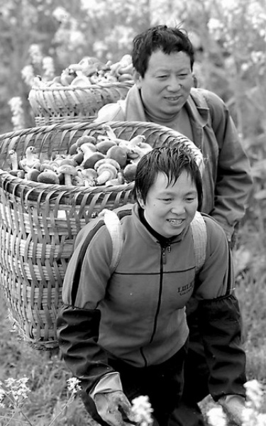 3月19日,在贵州省遵义县三合镇长青村,两位村民正在运送刚采摘的香菇。近两年,长青村的20多户村民靠当地农信社400多万“小额信贷”种植香菇,成为远近有名的香菇专业村。