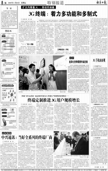 事实证明,中兴通讯在3G终端上获得了很大的市场认可。在2008年中国移动两次TD终端集采中,中兴通讯都以最大份额中标,占中国移动整体招标份额50%以上,其定制能力得到了运营商的高度认可。中兴也是目前市场占有率最大的3G手机厂商。