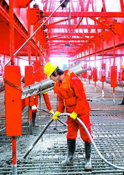 3月21日,施工人员在向莆铁路东新赣江特大桥工地浇筑首片50米1500吨箱梁。当日,向莆铁路东新赣江特大桥主桥开始正式制梁。横跨赣江的东新赣江特大桥是向莆铁路重点控制性工程,全长27.3公里,计划2010年6月完工。 胡国林摄(新华社发)