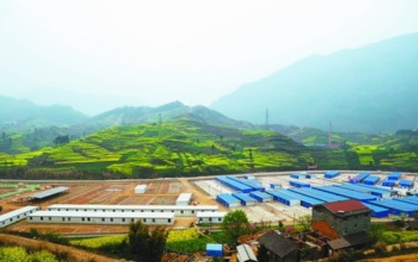 正在建设中的青川县竹园镇的一个浙江援建工地(3月20日摄)。 春临大地,四川地震重灾区青川县万木复苏,灾后重建工作在美丽的田园画卷中如火如荼地进行着。 新华社记者 江宏景摄