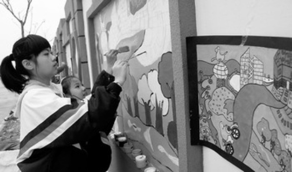 3月21日,浙江省温岭市新河镇中学的参赛学生在绘制壁画《回家的路上》。