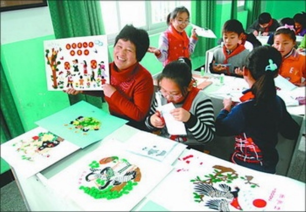 图二:梁弄镇正蒙小学,师生们正在进行布贴画实践活动。布贴画是余姚古老的民间剪贴工艺,为传承民间艺术,全面实施素质教育,许多学校都开设了布贴画课程,涌现出了许多优秀的作品和人才。