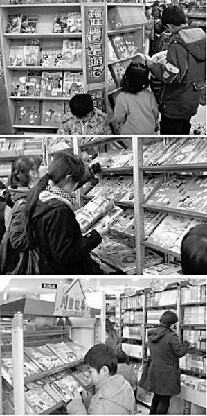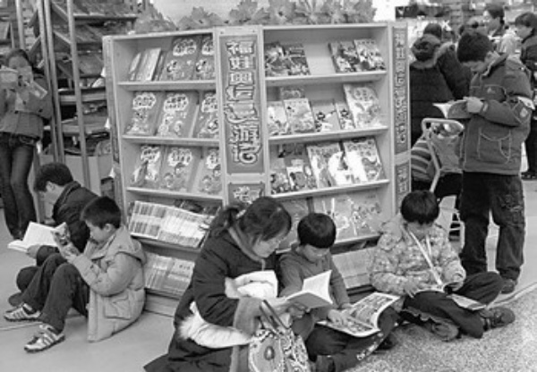 上图: 北京西单图书大厦。动漫书柜架前总是有许多正在看书的孩子。