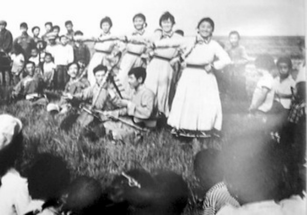 1985年,宝音朝古拉(右一)到蒙古族老艺人家里采集传统说唱艺术资料。 前郭县文化馆业余乌兰牧骑演出队历来有下乡演出的传统。图为上个世纪80年代队员们到草原上为牧民演出。
