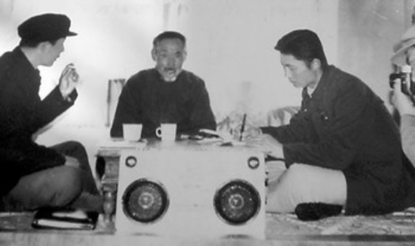 1985年,宝音朝古拉(右一)到蒙古族老艺人家里采集传统说唱艺术资料。