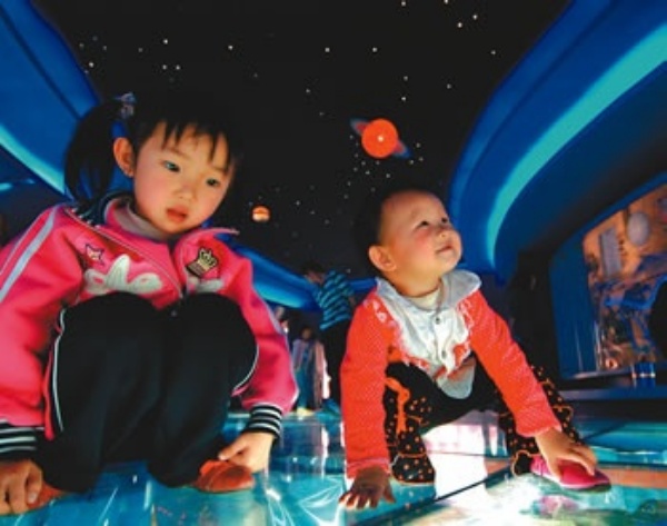 3月21日,孩子们在贵阳市气象科普馆内参观“屋顶的宇宙”。 当日,2000多名学生及市民来到贵阳市气象局参观,学习气象科普知识。为迎接3月23日的世界气象日,贵阳市气象局气象科普馆免费对市民开放2天。 程 洁摄 (新华社发)