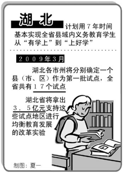 今年3月,湖北各市州将分别确定一个县(市、区)作为第一批试点,全省共有17个试点。湖北省将拿出3.5亿元支持这些试点地区进行均衡教育发展的改革实验。
