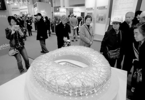3月23日,参观者在观看“鸟巢”电源自动节能系统模型。
