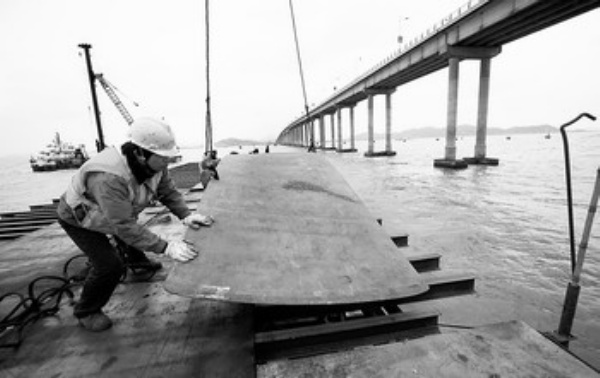 浙江省舟山市朱家尖大桥扩建工程目前正在进行钢栈桥及平台、墩桩基础施工建设。工程预计于2011年完工并通车,将进一步优化朱家尖、普陀山的交通基础设施条件。胡社友摄(新华社发)
