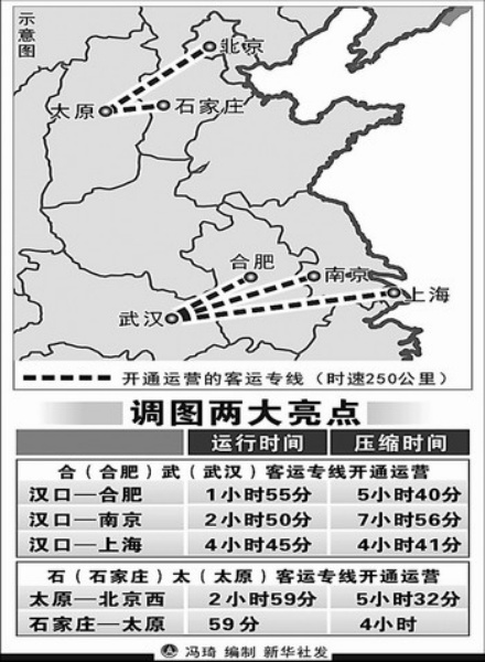 一是合武客运专线开通运营。合武、合宁客运专线构成了长三角与中南区域的最短路径,开通后开行8对动车组,将大幅压缩华东到中南的时空距离,促进两个区域的经济社会发展。汉口至合肥运行1小时55分,压缩5小时40分;汉口至南京运行2小时50分,压缩7小时56分;汉口到上海运行4小时45分,压缩4小时41分。
