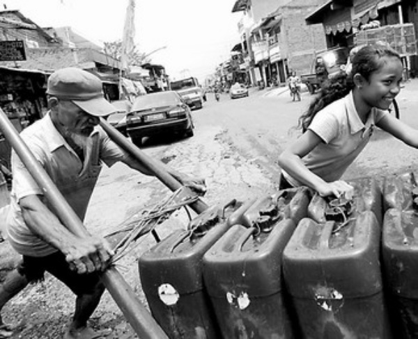 3月21日,在印度尼西亚首都雅加达,一名老人和小孩运送购买的清洁饮用水。近年来,由于无节制地抽取地下水和地表水污染,导致雅加达的清洁水资源短缺,部分居民只能以2000印尼盾(相当于1.16元人民币)一桶的价格购买清洁的水来饮用。新华社记者 岳月伟摄