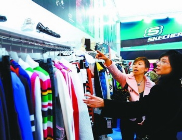3月26日,经销商在北京国展中心(新馆)一家服装展台前参观。当天,第十七届中国国际服装服饰博览会开幕。本届博览会划分为八大展馆、十大专项展区。800多个中外服装服饰品牌参展,预计约10万专业观众到会参观洽谈。本报记者 赵晶摄