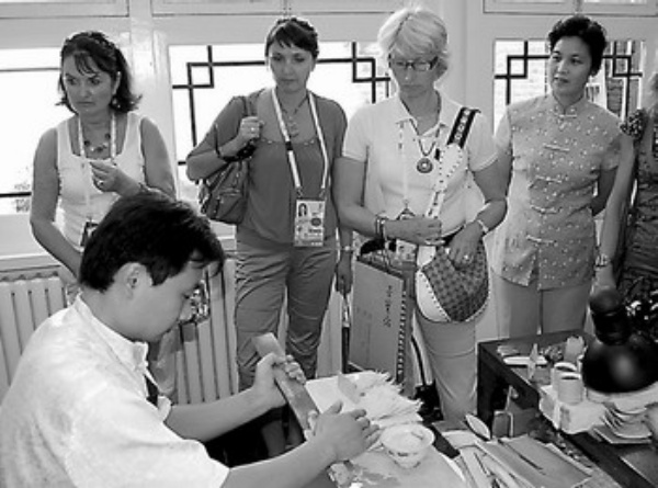 “戴月轩”利用“前店后厂”的形式,将毛笔制作与旅游结合,北京奥运会期间,这里接待了大量的国内外游客。图为外国游客正在观看笔工王后显的制笔技艺。