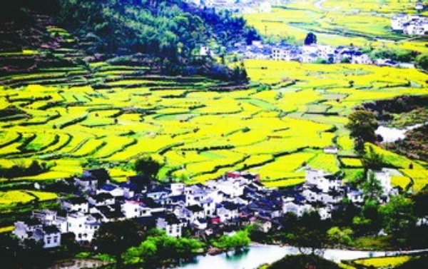 这是婺源县溪头乡江岭村梯田式的油菜花地,盛开的油菜花与徽派古民居交相辉映构成一幅美丽的田园山水画(3月28日摄)。阳春三月,江西婺源县十万亩漫山遍野的油菜花迎春盛开,吸引了超过36万名中外游客前来赏春,“菜花经济”成为婺源又一个新的经济增长点。新华社记者 宋振平摄