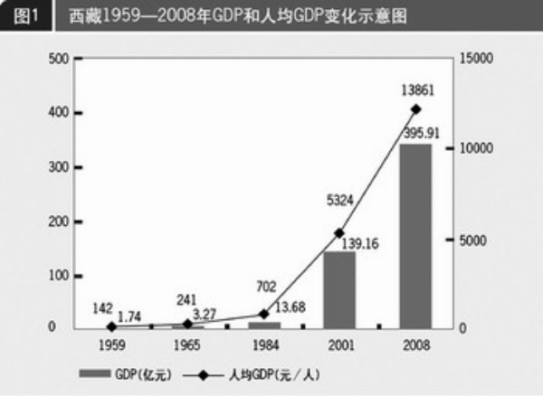 讨论增长与发展,首先必须研究发展的基础和条件。2008年西藏的GDP为395.91亿元,人均GDP达到13861元。虽然这一指标与全国人均水平22698元相比还有不小的差距,但应该看到,1959年西藏民主改革时期,全区生产总值只有1.74亿元,人均GDP仅为142元(注1),西藏今天的经济增长是从如此低的水平开始起步的。