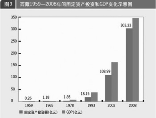 西藏的经济增长受投资拉动影响显著。通过对西藏自治区固定资产投入和地方财政收支情况进行分析后发现,从1959年到2008年间,西藏固定资产投资从0.29亿元增长到303.33亿元,年均增长率达到15.2%。从1985年,即西藏宣布对外开放的第二年开始,固定资产的投入就占当年GDP的42.2%,较过去增长了至少10个百分点。从此,西藏固定资产的投入开始大幅度增加,占GDP的比重保持了较高水平。1984—1994年的10年里,西藏固定资产的投入占GDP的比重均在40%以上,1995年这一比例上升至66%,1996—1998年的2年里,这一比例回落至45%—47%之间。此后,西藏对固定资产的投入再度加快,从2003年到2008年的6年里,西藏固定资产投入占GDP的比重始终保持在75%以上,比全国平均水平高出20多个百分点。
