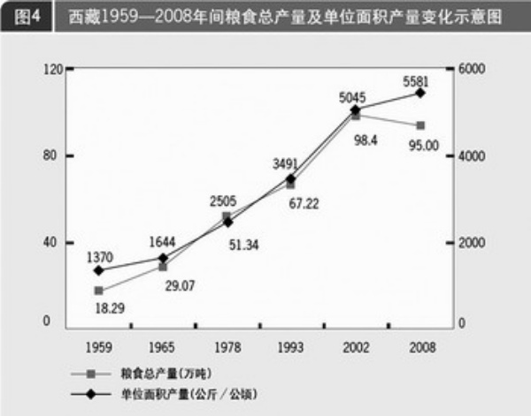 2008年,西藏第一产业增加值达60.51亿元,占GDP的15.3%。西藏粮食播种面积17.02万公顷,粮食产量达到95万吨,粮食生产总量已经连续10年稳定在90万吨以上,每公顷耕地的粮食产量达到5581公斤,较1959年的1370公斤/公顷增长了3.1倍。据对统计数据的分析表明(注7),2008年,西藏人均粮食产量约333公斤,人均占有量近1公斤/天。而1959年实行民主改革前,西藏的年人均粮食产量仅为150公斤左右,人均占有量不足0.5公斤/天。