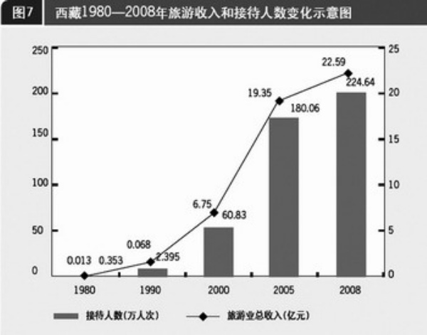 随着青藏铁路的建成通车,西藏旅游业迎来了高速发展时期。2008年,全年接待国内外游客224.64万人次,比1980年到1997年的总接待人数还要多;全年旅游总收入达到22.59亿元,接近1980年到2000年的总和。目前,西藏已形成了以拉萨为中心,日喀则、山南、林芝地区相衬托,辐射那曲、阿里和昌都地区的旅游资源格局。  目前,旅游业除对全区生产总值、外汇收入产生重大影响外,对劳动就业、税收和城乡居民生活水平的作用和贡献亦日渐突出。旅游业已成为直接吸纳劳动力就业,拉动人民增收的重要渠道。