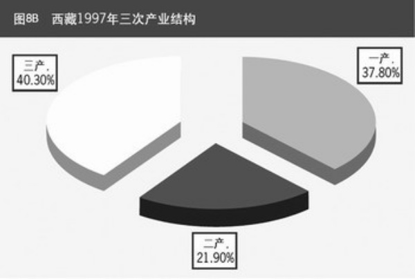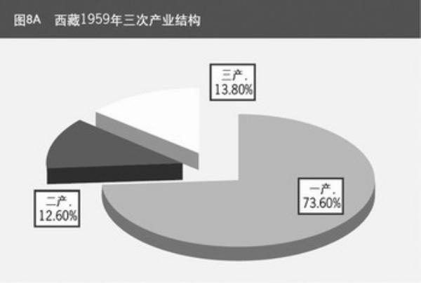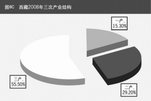 1959年,西藏一产、二产和三产在GDP中的比重分别为73.6%、12.6%、13.8%,第一产业增加值占GDP的70%以上,是一个典型的农业社会。1997年,西藏一产、二产和三产在GDP中的比重分别为37.8%、21.9%、40.3%,第三产业增加值占GDP的40%以上,第三产业成为第一大产业。2008年,西藏一产、二产和三产在GDP中的比重分别为15.3%、29.2%、55.5%,第三产业增加值占GDP的55%以上,第三产业的主导地位日益突出。