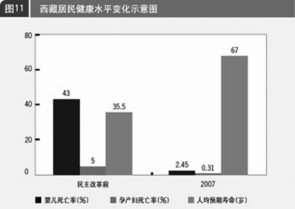第二,人均期望寿命是衡量人类发展的一个重要指标,现阶段西藏全区人均预期寿命为67岁,而在旧西藏,西藏的人均预期寿命仅为35.5岁。