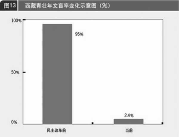 民主改革前,西藏自治区文盲率在95%以上。为尽快提高广大人民群众的教育水平与科学文化素质,西藏自治区政府加大了基础教育的发展力度,并大力开展了扫除青壮年文盲的工作。2008年底,全区73个县已经全面完成“普六”任务(注14),其覆盖率达到100%,小学在校生达到31.18万人,入学率达到98.5%;有70个县实现“普九”目标(注15),覆盖率达到90.2%,初中在校生达到13.99万人,入学率达到92.2%。高中教育规模逐渐扩大,全区高中在校生达到4.46万人,入学率达到51.2%。目前,西藏自治区全区人均受教育年限已经达到6.3年。此外,对全区未接受学校教育的成年人,特别是50周岁以下的人口,通过办扫盲班、夜校等形式的扫盲教育,使青壮年文盲率下降到2.4%以下。