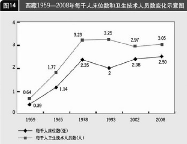 民主改革以来,鉴于旧西藏只有3所官办的藏医机构和少量私人诊所,医疗设备极其简陋,医务从业人员不足400人,每千人拥有医务人员还不到0.4人的状况,国家对西藏全区人民实行特殊的卫生保健政策。在城镇实行个人医疗资金账户和公办民助相结合的医疗费用承担办法,在西藏农牧区实行免费医疗。近50年来,国家累计拨付专项经费18亿多元用于发展西藏的医疗卫生事业,每年用于农牧民的医疗补贴超过2000万元。2008年底,西藏全区卫生机构达到1339个,比1959年增长了近20倍;全区卫生机构拥有床位从1959年的480张增加到2008年的7127张,每千人拥有床位为2.50张,比1959年增加了2.11张;全区卫生技术人员从1959年的791人增加到2008年的9098人,每千人拥有卫生技术人员3.05人,比1959年增加了2.41人。西藏自治区每千人拥有床位数和卫生技术人员分别高于全国平均水平,也高于中等收入国家平均水平(注18)。