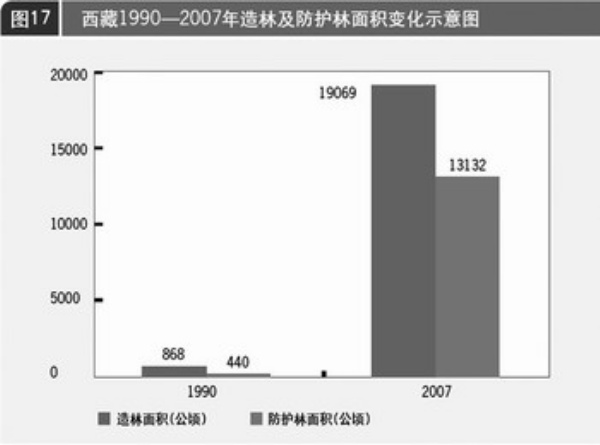 通过对西藏天然林资源的有效保护和植树造林,西藏森林覆盖率不断提高。造林面积从1990年的868公顷增长到2007年的19069公顷,增长了20多倍,其中对生态环境保护具有重要作用的防护林面积由1990年的440公顷增长到2007年的13132公顷,增长了近30倍(注24)。