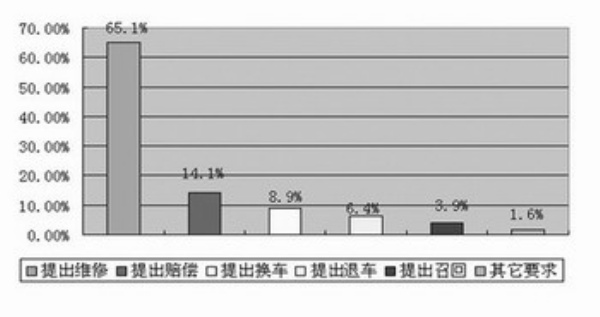 统计分析表明,汽车用户投诉的主要问题集中在安全性、驾驶乘坐舒适度、维修服务(包括重要零部件损坏只修不换、要求保修期延长、服务态度差等)方面。2008年度中国汽车产品质量及服务质量投诉的主要特点表现为:一、全年投诉中,涉及重要零部件如变速箱、刹车系统、发动机等的投诉比上一年明显增加,很多汽车产品是购买半年或者刚做完首期保养的新车。其中,变速箱的投诉最为突出,主要集中于8万—25万元的汽车产品。问题表现为变速箱不能正常换挡、手动变速箱打齿轮、异响、漏油等问题;二、对轮胎的投诉比较突出,主要反映是鼓包、开裂等,问题多集中于5万—20万元的汽车产品,多在行驶1万公里内出现,多数车主认为问题严重程度已威胁到驾驶安全,以致形成集体投诉;三、用户对汽车异响的投诉呈上升趋势,涉及车型不同部位。发生异响的部件主要集中在发动机、变速箱、仪表盘、刹车、方向盘等。多数用户反映异响不能查明原因,大大降低了车辆的舒适性;四、相比以往,对合资厂家的投诉增加10%,涉及重要零部件的投诉占到60%以上;五、服务方面的投诉主要集中在服务承诺不兑现、配件等待时间长、屡修不好等,屡修不好是引发服务问题的主要原因;六、有关机油消耗量大的投诉继续有增无减,产生纠纷的主要原因是厂家和用户对机油消耗量的认知不同;七、对车辆的小配件和内饰方面的投诉日益增多,涉及汽车产品价格多为15万元以下车型。