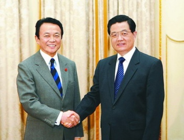 胡锦涛表示,当前中日关系总体保持良好发展势头。去年,我对日本进行国事访问,两国领导人签署第四个政治文件,这标志着中日战略互惠关系进入了一个新的发展时期。当前,国际形势正在发生深刻变化,特别是国际金融危机给各国带来严重影响。在这样的形势下,中日两国加强合作、齐心协力、共克时艰更加重要。为此,建议从以下几个方面进一步推进中日关系,确保两国关系健康稳定发展。一是保持两国高层交往势头。继续落实双方达成的两国领导人隔年互访共识。两国领导人还可以利用多边场合保持频繁接触,及时就两国关系和其他有关重大问题交换意见。二是进一步推动经贸合作。中日互为重要经贸伙伴。今年以来,受国际金融危机影响,两国贸易出现下滑。双方应该采取措施,克服困难,挖掘潜力,拓宽渠道,力争今年双边贸易额保持稳定。双方还应该主动调整贸易结构,加强信息、环保、高技术等领域合作,培育新的增长点。三是持之以恒开展各领域交流。要继续深入开展两国政党、立法机构、军方交流和对话,增进两国安全互信。加强两国人员交往特别是青少年交往,加大投入,创新形式,丰富内容,争取经过一段时间努力,使两国友好社会基础得到进一步增强。四是加强两国在国际事务中特别是在亚洲的合作。