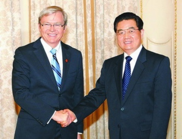 4月2日,国家主席胡锦涛在伦敦会见澳大利亚总理陆克文。 新华社记者 姚大伟摄