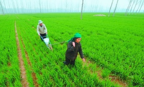 4月3日,兰考县东坝头乡农民在麦田里追肥。河南省兰考县农村根据《河南省春季麦田管理技术规程》因地因苗制宜,加强麦田管理,确保今年小麦丰收。 新华社记者 赵 鹏摄