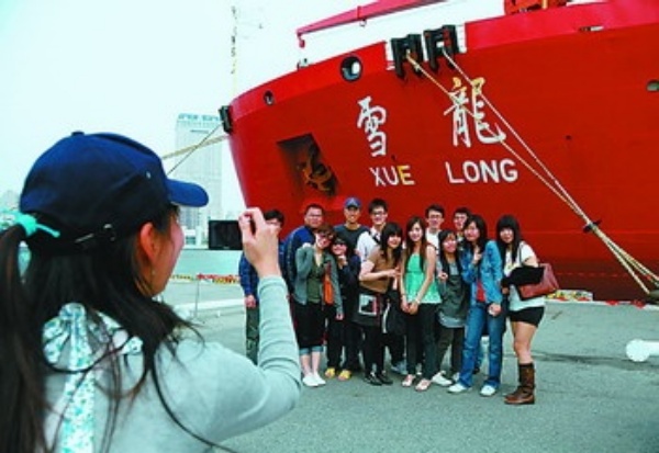 4月3日,一群高雄中学生在“雪龙”号前拍照留念。 4月1日,“雪龙”号极地科学考察船停靠台湾高雄港,于2日、3日向当地民众开放,2000余名科学工作者、学生、市民登船参观“雪龙”号和极地科学考察成果展览。 新华社记者 余福卿摄