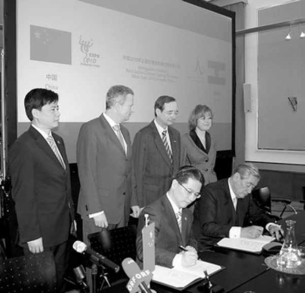 日前,奥地利参加2010年上海世博会签字仪式在奥地利联邦经济部举行。奥地利经济部部长赖因霍尔德·米特勒纳、奥地利联邦商会会长莱特尔、奥地利特命世博会总代表汉内斯·安德罗施在签约仪式上高度评价了上海世博会的组织工作,期待在国际金融危机的背景下,上海世博会能够使世界经济重振信心,并为加深中奥两国经济项目合作提供新契机。 图为奥地利展区总代表汉