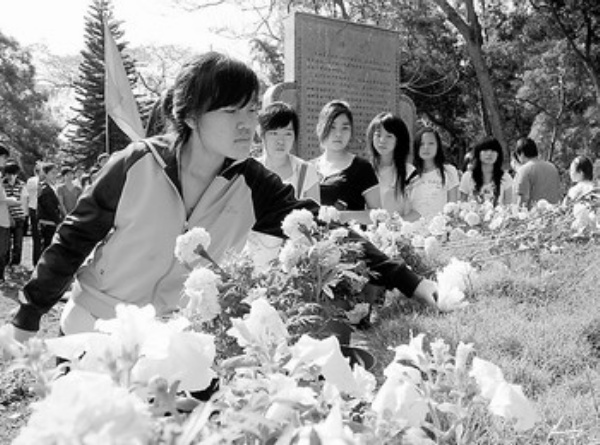 4月4日,学生们为先烈献上鲜花。 当日,海南大学的学生、解放军某部的官兵以及海南省各界群众上千人来到海口市金牛岭烈士陵园扫墓,缅怀烈士。 新华社记者 郭 程摄