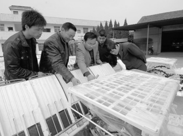 4月7日,浙江省长兴县农机管理站的站长宋宝良(左三)正在给前来选购插秧机的农民介绍机器性能。随着国家进一步加大农机补贴力度,农民购买农机的热情高涨,订购数量也比往年有较大增幅。 新华社记者 徐 昱摄
