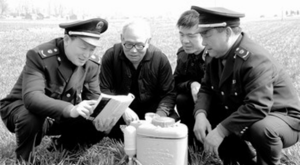 日前,河南新蔡县工商局栎城工商所人员深入到韩集镇小李庄村李忠祥家的麦田里,面对面地指导他如何识别和购买农药以及正确使用农药防治小麦锈病和虫害。 赵学风 杜德广摄