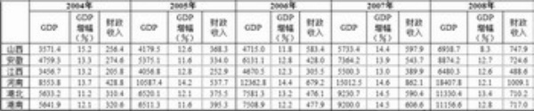 说明:本版表格2008年数据来自各省及全国国民经济和社会发展统计公报,2004年至2007年数据来自历年各省及全国统计年鉴。其中财政收入栏各省数据为地方一般预算收入;中部地区GDP占全国的比例,由中部六省数据相加除以全国GDP总量得出。