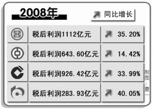 2008年,在国际金融危机冲击下,四大国有商业银行的盈利状况最受瞩目。工行突破性地实现税后利润1112亿元,较上年同期增长35.2%;中国银行税后利润达643.60亿元,同比增长14.42%;建行税后利润926.42亿元,同比增长33.99%;交行税后利润283.93亿元,比上年增长40.05%,增长幅度最高。更为可喜的是,四大银行的资产盈利能力大幅上升,资产回报率均超过了1%,建行的资产回报率为1.31%,达到国际先进银行的水平。从资本回报情况看,建行的资本回报率最高,为20.68%;工行资本回报率的增长速度最快,2008年较上年度提高了3.2%。交行资产质量最好,不良贷款率为1.92%。分析四大行年报,利润增长主要得益于以下两个原因:一是净利息差扩大。工行净利息差比上年上升0.13%达到2.8%,交行净利息差比上年提高10个基点达到2.88%。二是成本控制较好。工行成本收入比较2007年下降了5.18个百分点达到29.84%,建行成本收入比较2007年下降了5.21个百分点,为30.71%。