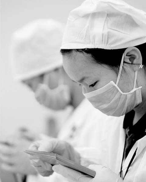 上图:江西新余赛维公司的员工正对生产出的硅片进行质量检测。 董昂摄