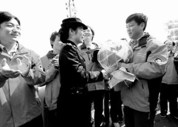 4月9日,上海吴淞边检民警向我国南极昆仑站首任站长李院生(前右一)献花。