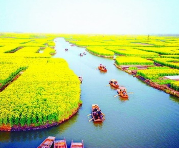 游人划着小船穿梭水巷观赏油菜花盛开的美景。