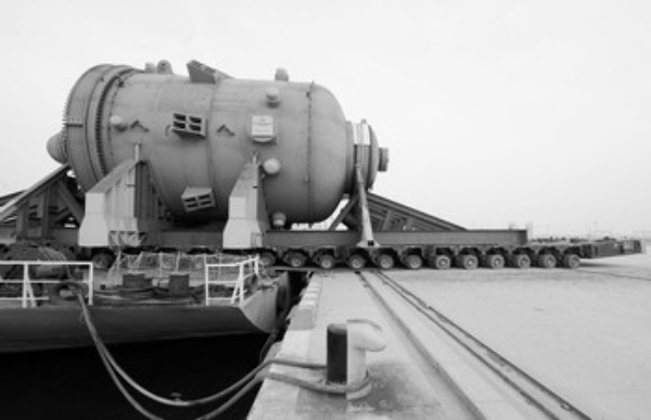 当日,天津石化100万吨乙烯及配套项目整台重量最重、最昂贵的设备————EO反应器在天津临港顺利完成滚装卸船作业。据介绍,该设备本体净重1182吨,采购价格逾2亿元人民币。新华社记者 刘海峰摄