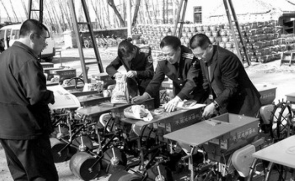 4月10日,黑龙江省林口县质量技术监督局的执法人员在一家农机具生产厂家核对出厂播种机的随机配件清单。当日,林口县质量技术监督局执法人员对全县12家播种机等重点农机具生产企业的产品质量和执行标准进行检查,为春耕生产提供保障。张春祥摄(新华社发)
