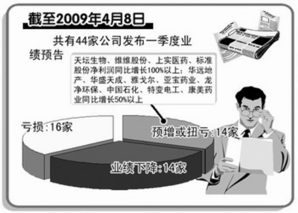 据初步统计显示,截至4月8日,共有44家公司发布一季度业绩预告,其中14家公司预增或扭亏,14家公司预计业绩下降,16家公司预计出现亏损。业绩公告显示,天坛生物、维维股份、上实医药、标准股份等上市公司预计1—3月份净利润与去年同比增长100%以上。华远地产、华盛天成、雅戈尔、亚宝药业、龙净环保、中国石化、特变电工、康美药业等上市公司预计2009年1—3月的净利润将比去年同期增长50%以上。