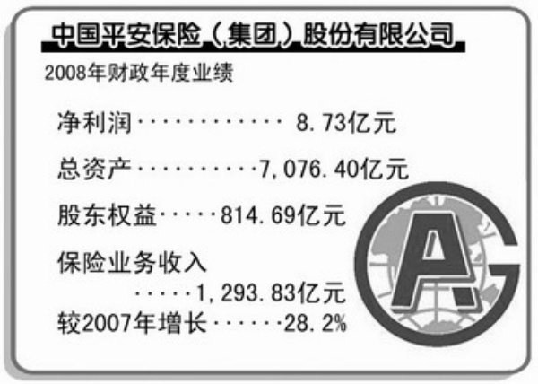 本报讯 记者殷楠报道:中国平安保险(集团)股份有限公司4月8日宣布其2008年财政年度业绩。2008年,面对国际金融危机和国内自然灾害的冲击,中国平安凭借稳固的业务基础和稳健的经营管理及多元化利润来源贡献,实现净利润人民币8.73亿元。逆境下,平安保险、银行、证券、信托等主营业务取得健康稳定的发展,综合金融优势进一步加强。 年报显示,平安集团2008年实现净利润8.73亿元,较2007年下降94.4%。总资产达到人民币7076.40亿元,股东权益达到人民币814.69亿元。保险业务收入人民币1293.83亿元,较2007年增长28.2%。基本每股收益为0.09元。