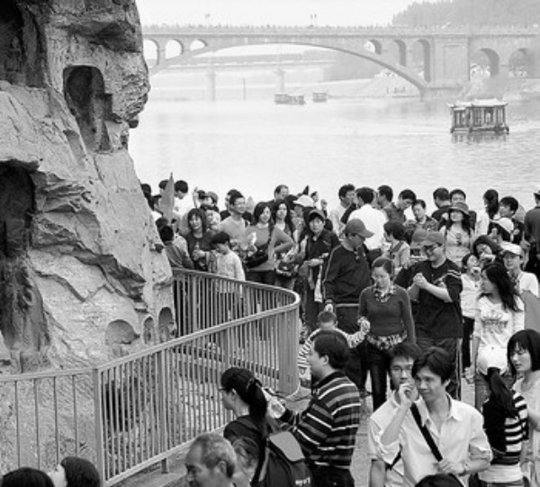 4月11日,众多游客在龙门石窟景区参观。 4月10日和11日两天,前来洛阳龙门石窟景区旅游的各地游客超过10万人次。 新华社记者 王 颂摄