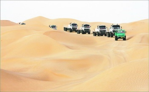 左图 行驶在塔克拉玛干沙漠中的沙漠运输车队。20年来,沙漠运输公司以精良的设备、过硬的技术、严格的管理和优质的服务,确保了油田沙漠腹地勘探开发任务的完成。