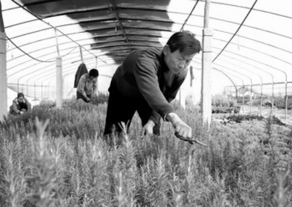 4月12日,工人们在山东乳山农民曹永杰的香草种植基地里为香草剪芽。今年29岁的曹永杰在外打工7年后返乡,发展起种植面积达27亩的香草种植基地,目前种植有薰衣草、薄荷、迷迭香等40多个品种。 刘国贤摄(新华社发)